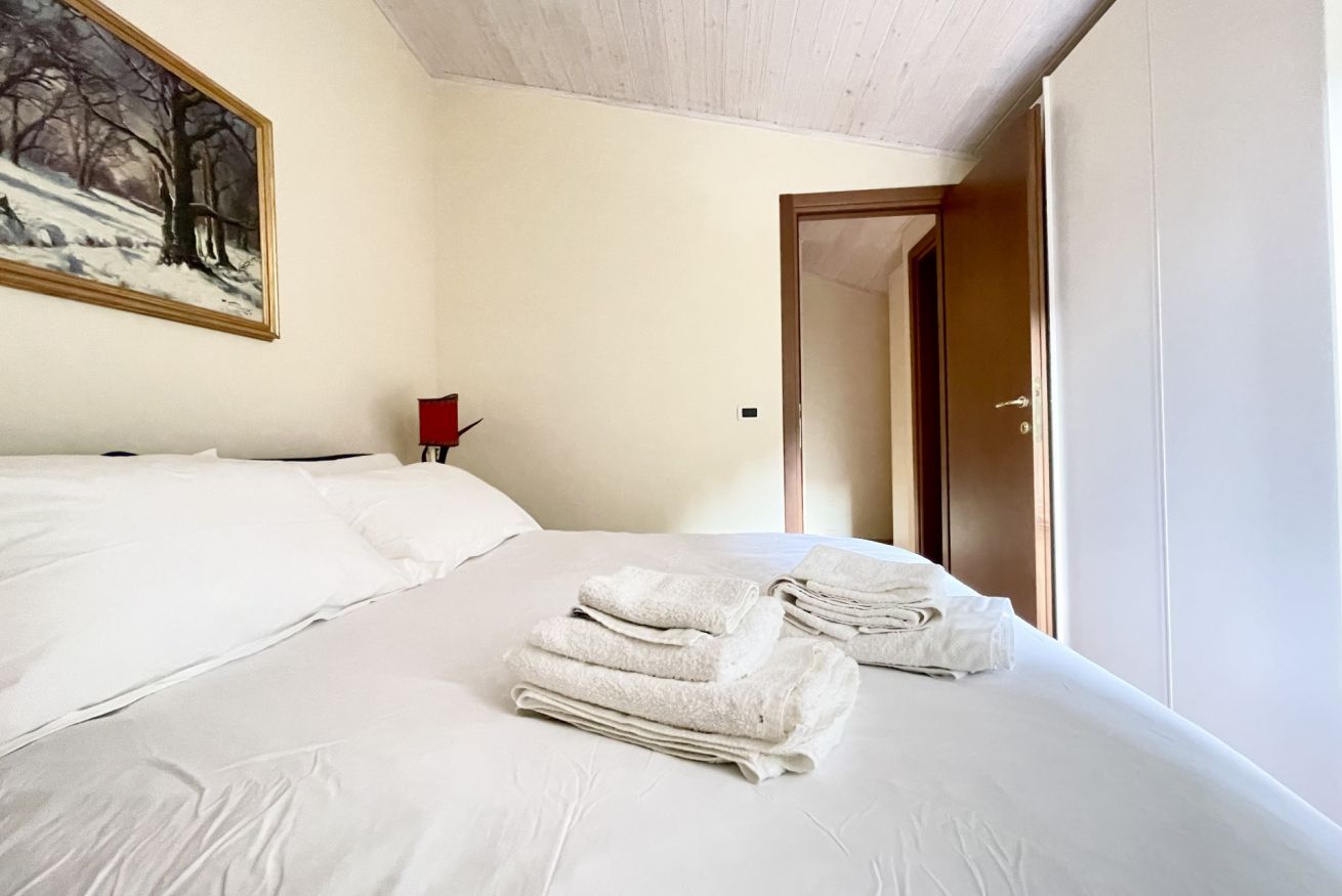 Al primo livello troverai un ampio salone open space con cucina attrezzata, divano letto matrimoniale con materasso alto, TV a schermo piatto, tavolo da pranzo, due terrazzi panoramici e un bagno di servizio. L’ambiente, impreziosito dal pavimento in cotto e da un camino decorativo (non utilizzabile), combina stile montano e design contemporaneo.